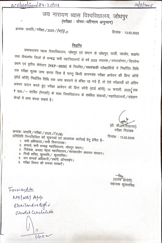 JNVU - Date Extention For Submitting Of Exam form Hard Copy 2024-25