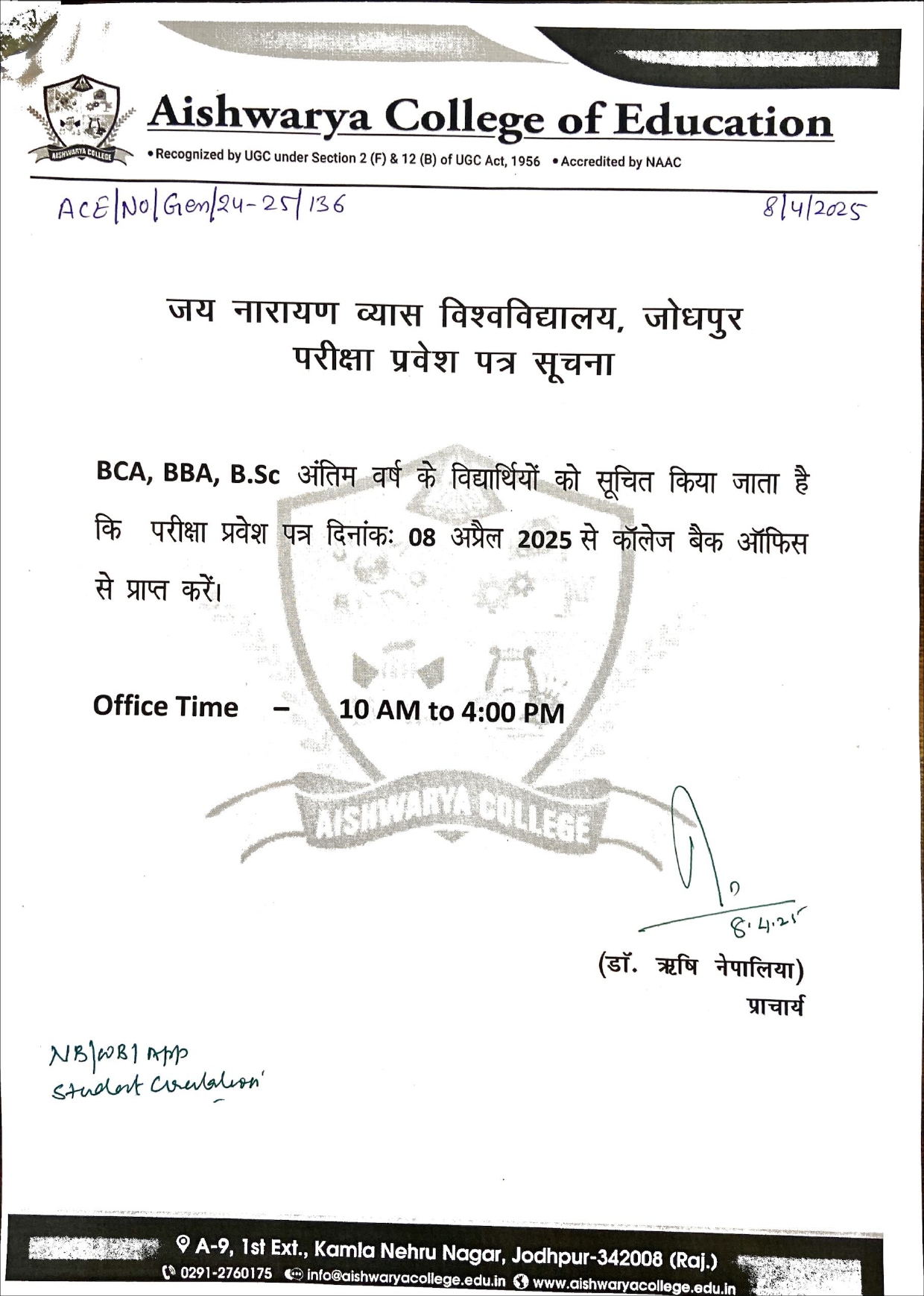 JNVU - BCA, BBA & B.SC - Admit Card Notice 2024-25